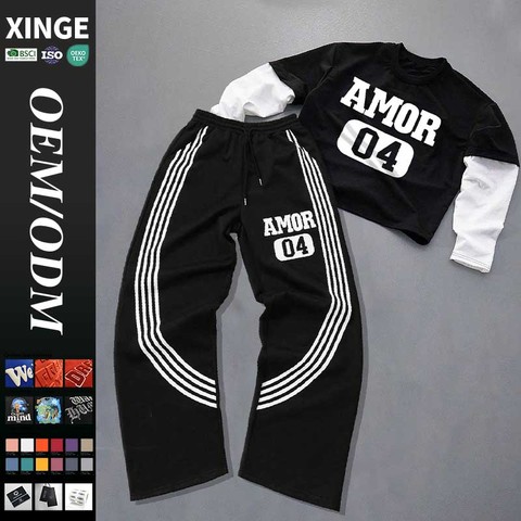 Streetwear Fabrikant 2 Stuks Dubbele Mouw T-Shirt Gestreepte Wijde Pijpen Joggingbroek Set Custom Digital Printing Heren Trainingspak